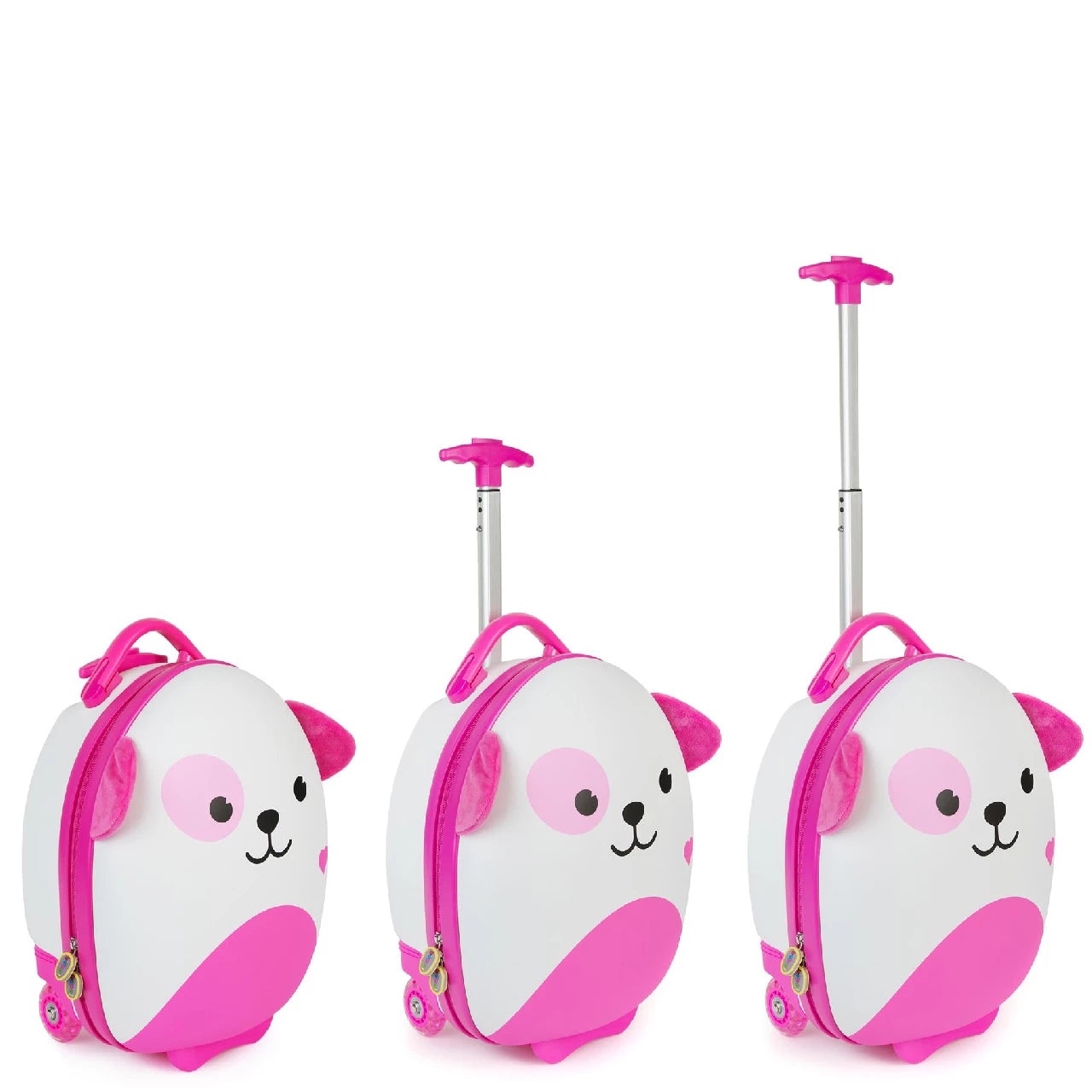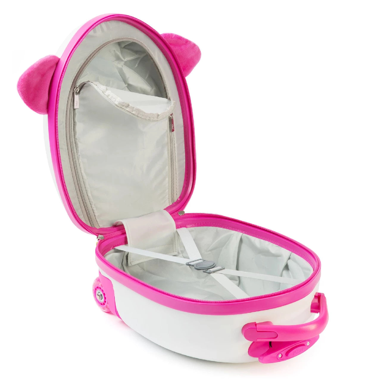 Выдвижная ручка с двумя уровнями высоты обеспечивает лёгкую транспортировку и подходит детям разного возраста и роста. Чемодан предлагает просторное отделение для хранения с ремнями, а также внутренний отсек на молнии для предметов, игрушек, мишек и ценностей.